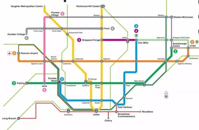 此外,Jane(图中粉色) 和 Sheppard East轻轨(图中淡绿色)以及 SmartTrack (图中深蓝色细线)也将陆续建成。