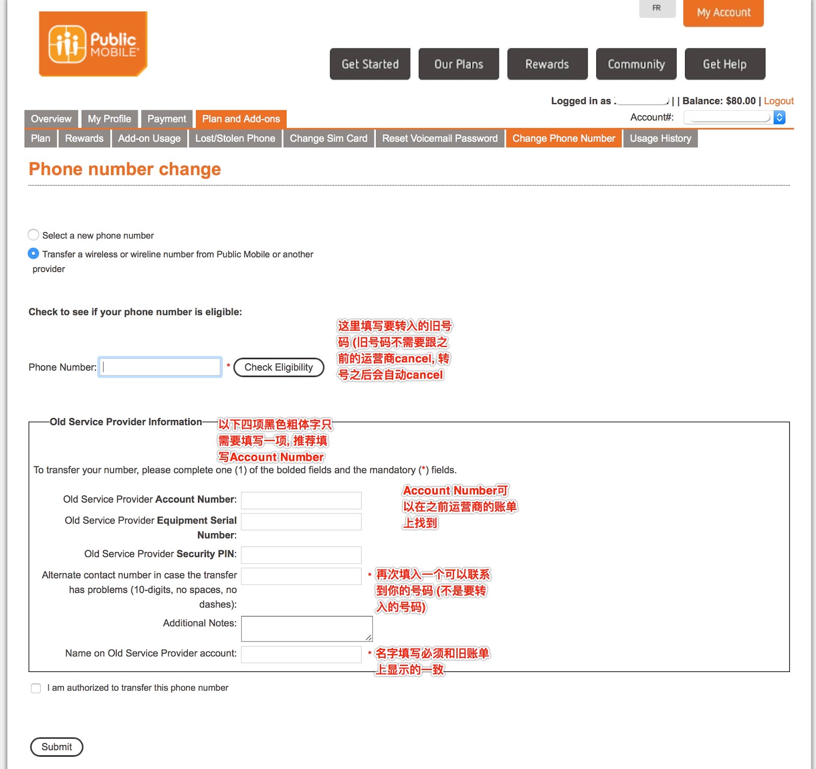 拿到SIM卡之后,访问https://activate.publicmobile.ca/?raf=ON9Q35 卡片背面可以找到SIM number。看到Were you referred to Public Mobile by a friend,如果有推荐人,则这里可以填入ta的Public Mobile推荐码。(前面的链接为本站提供的referral,本站推荐码:ON9Q35) 这一步填写常用Email (如果是准备从Koodo Mobile后付费转来,请使用与你Koodo账户不同的Email地址),以及设置密码和安全问题。PIN可以填写四位数字,PIN并不会用到,登录账户只需要用刚刚设置的密码。 确定手机号码。选新号这里就不赘述了。要转号的朋友,先去尝试直接转号(Transfer a wireless or wireline number from Public Mobile or another provider),按照以下图片教程填写。注意Account Number并不是手机号!要去以前的账单/账户上找,填写时忽略短横线(-)和空格,仅填纯数字/字母组合,如123-456 78则填12345678,基本都会直接成功。若报错无法转号,那么就要先选一个新号码(Select a new phone number),整个激活过程完成后再进入Self-service尝试转号。若此后转号仍不成功,请去Community(需注册一个单独的帐号)给Moderator发私信提供相关信息(两边的手机号、帐号、PIN),让Moderator给你解决。据了解,如果是从Koodo Prepaid转来,Public Mobile网页上会建议先选新号,激活后再转号操作。
